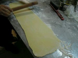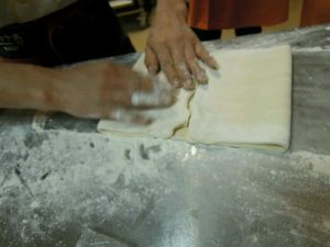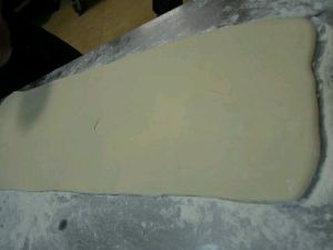 台面撒粉——赶成长方形(长度是宽度的四倍)——折四折