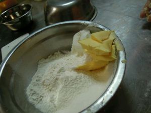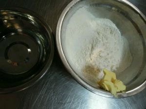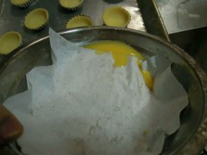 水皮部分: 将过刷的低粉88g 高粉37g 细糖13g 黄油10g 吉士粉8g称好倒入台面
