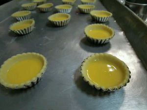 过筛后的蛋挞液,舀入蛋挞皮中,八分满。