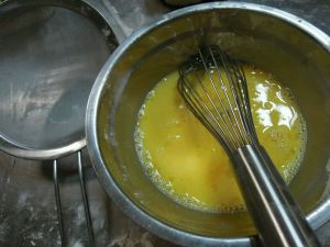 打匀的蛋挞液,过筛,可以让口感更细腻。