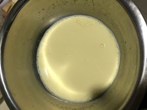 倒入牛奶、淡奶油,白砂糖小火使白砂糖融化,关火凉下.打散蛋黄,把蛋黄液满满的倒入牛奶里搅拌均匀。(记住千万别是烫的牛奶,那样蛋黄倒进去就熟啦)