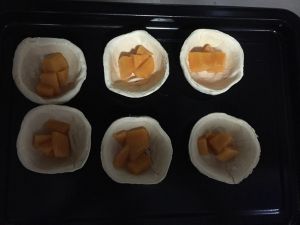 烤盘放烘培纸,将蛋挞逐一放在烤盘里