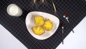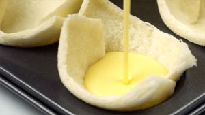将搅拌均匀的蛋挞液倒入蛋挞皮内