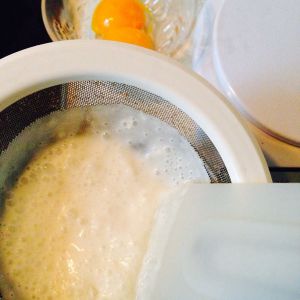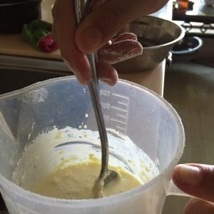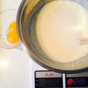3,上述溶液放凉后,加入2个蛋黄液,搅拌均匀。之后筛入低粉,尽可能地搅匀,使之见不到颗粒状的低粉。