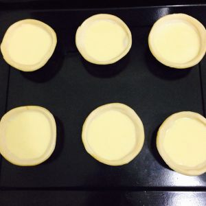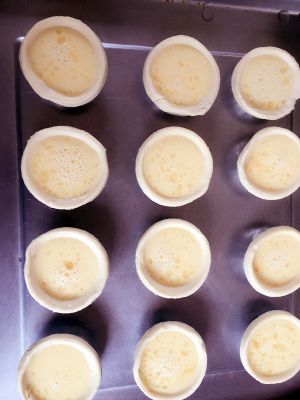 4、上步骤进行的同时将11个蛋挞皮从冷冻室内拿出来稍微解冻,180度预热烤箱。接着把蛋挞液徐徐倒入蛋挞皮里,量约2/3。
