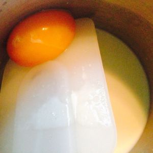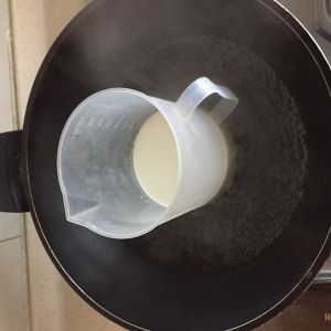 2、将牛油、牛奶和白砂糖放在容器里隔水加热,使糖熔化。如果用的是糖粉,这步可省略。