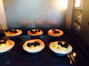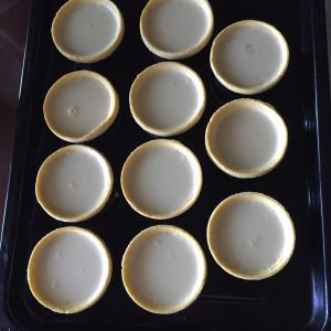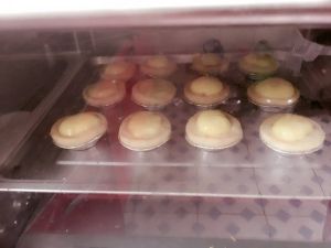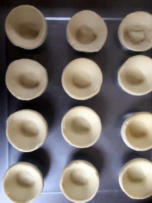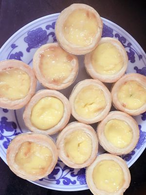 第三步;烤箱预热二分钟、在放入蛋挞、上下火180-190度、20-30分钟、根据自己家里的烤箱功率、有空的话最好看着点、蛋挞上色后、可关到150度
