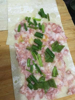 把肉沫涂在馄饨皮上 还有葱段 撒盐 以此类推 可以叠加在上面