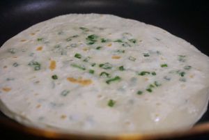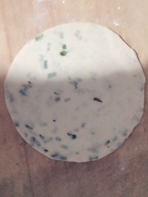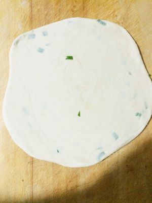 用擀面杖擀成薄面皮,刷一层冷却后的加热过的,撒上葱花和适量盐