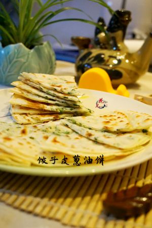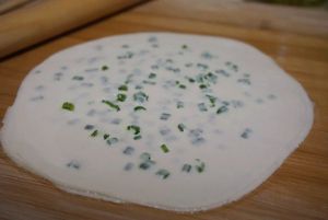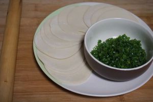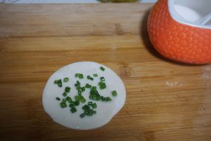 饺子皮上刷一层薄油,撒上一点点盐,铺上葱花。