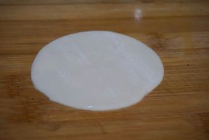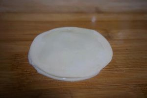 用擀面杖横向、纵向的擀一擀,擀成薄片。