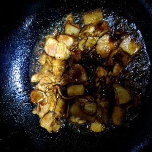 然后把蒸熟的面条放进炖好的肉菜中。放点鸡精。