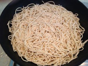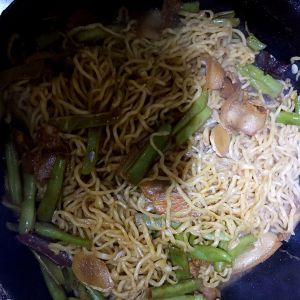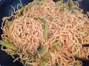 炒扁豆那样,先把扁豆炒六、七成熟(我放油后,放两个香姑,煸炒,放扁豆,炒五成熟的时候,放一个西红柿),放盐,放少许酱油,糖,扒拉匀后,放开水,开小火,一两分钟后,盛出三分之二的汤,面条平铺在扁豆上,盖上锅盖,期间尽量不要开盖子,感觉汤快没了,开盖,加入盛出来汤的一半,马上再盖上锅盖