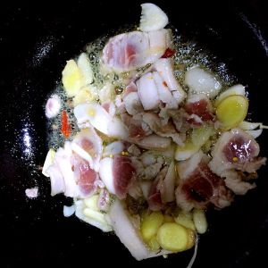 锅中放油,热后下入葱花炝锅,炒出香味后下入五花肉翻炒