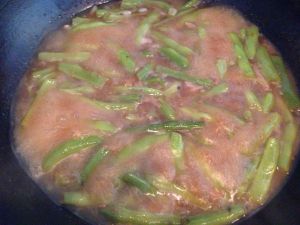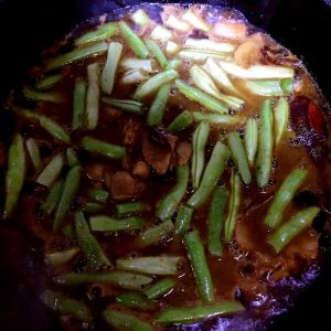 肉变色后放入扁豆,倒入酱油,继续翻炒至变色后加入水,没过扁豆即可