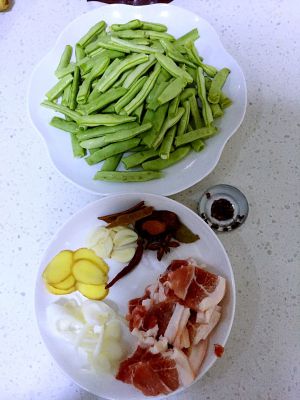 食材合影啦。扁豆清洗干净,掰成段,葱姜和蒜切片,五花肉切成薄片。