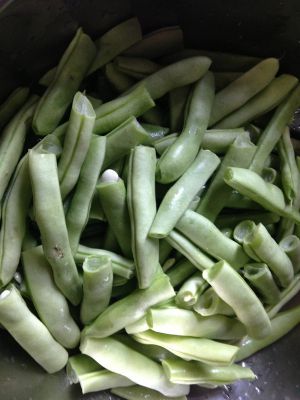 出油后放料酒翻炒,加老抽、再翻炒、放花椒炒出味,放姜葱豆豉炒出味!放扁豆,翻炒均匀,加盐、鸡精翻炒。加水,没过扁豆。**注意了,这次菜加盐要加够,后面加盐不好弄,这是最好尝尝味,水呀最好一次加够,中途加水面会不好吃哦!