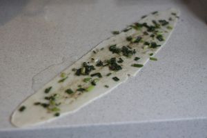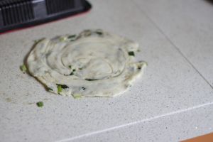把加入葱的面团卷起来,稍微擀平一点,好熟些