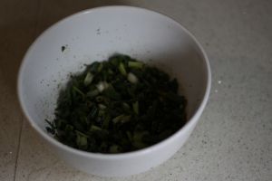 往碗里加入面粉,和少许盐,倒入适量温开水,揉成面团,再分成小面团,切好葱