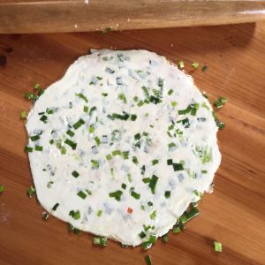 面皮上抹油,油多才香,撒盐,撒葱花。