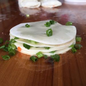 小葱切好加一点香油,鸡粉,十三香和盐搅拌均匀,一定要用之前加盐,加早了放着不用会把小葱里的水分腌出来,案板刷油一层饺子皮一层葱花,在放一张饺子皮刷油放葱花,重复步骤,差不多到五张六张饺子皮就可以了