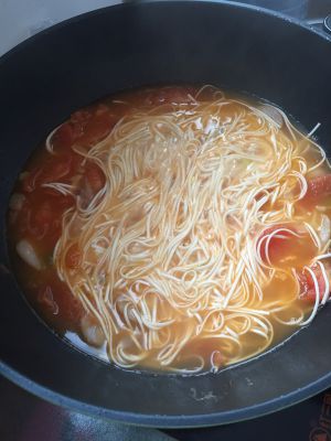 葱花爆锅下入去皮切好的西红柿炒烂填入开水,烧开了之后下入挂面