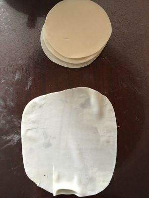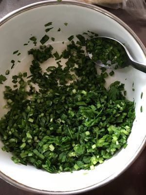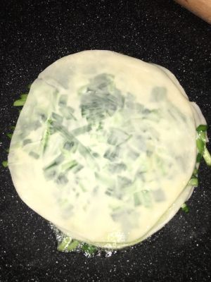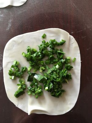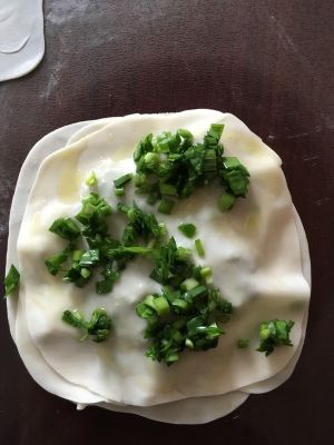 再叠一层擀好的饺子皮,再刷油,洒韭菜,这样搞个4层