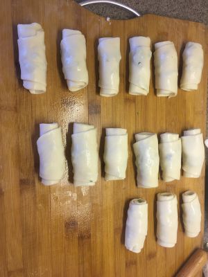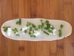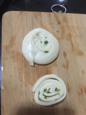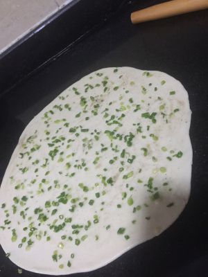 洒上猪油,菜籽油,盐和五香粉,最后撒上葱花,沿着边缘卷起来