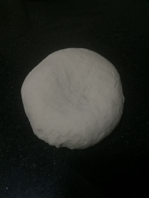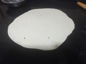 用手轻轻按一下面团,把面团慢慢压平,摊开。