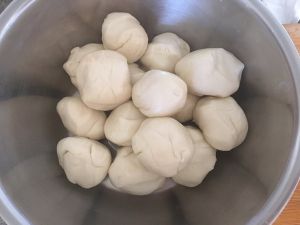 平均分成4块,揉圆,盖保鲜膜醒10分钟,利于擀饼