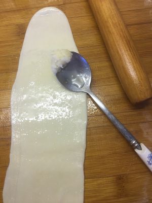 拿出一份搓成长条擀成长圆形在表面抹上色拉油,油酥,放少许猪板油