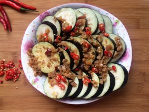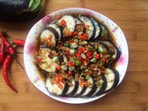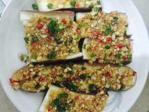 茄子隔水蒸15分钟后取出,倒出蒸盘子里蒸茄子出的水份,然后浇上我们调的汁搅拌均匀就可以了