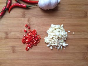 大蒜切成蒜米,朝天椒切成辣椒圈。