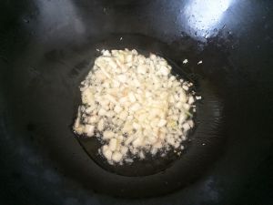 热锅凉油,先用小火将蒜米煸出香味,呈金黄色。