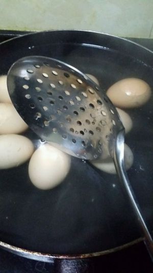 煮好后,用小勺把鸡蛋壳敲裂,怕烫的话可以边冲冷水边敲。 (提示:鸡蛋一定要先煮熟,因为要把壳敲裂,味道可以卤进去。)