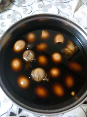 鸡蛋放入压力锅,加水末过鸡蛋,水多点没关系,放入全部调料,盐可以多加一些,比较入味,没有压力锅可以用普通的锅煮,压力锅入味快。压力锅调到闷炖就可以。煮好后放在那里不要动,或者看鸡蛋没碎的再敲敲,泡一晚,第二天早晨可以吃了。如果用普通的锅煮,可以多加水,煮过之后也要保证锅里有汤,鸡蛋可以泡在里面。