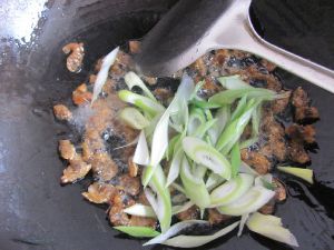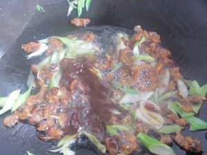 倒入配料,加盐,倒入水蒙煮一会,等水收干,出锅