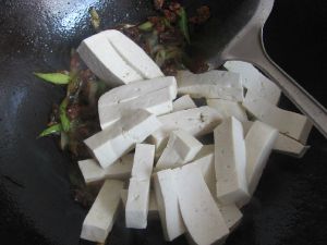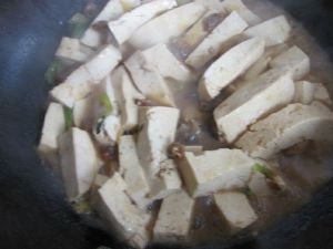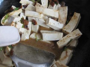 下豆腐,轻轻炒几下,掺入开水(高汤更好),小火慢煮10分钟