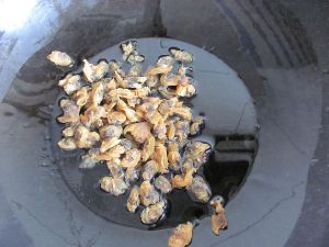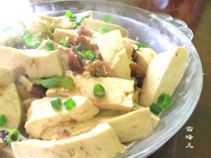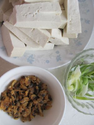 豆腐切条,葱切丝,干蛤蜊肉备用。