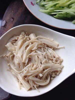 烧开水,放入洗好的金针菇和胡萝卜丝,几分钟熟了之后放在干净的碗里放凉。