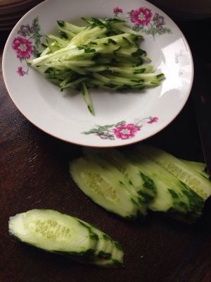 黄瓜切片切丝,放一点盐腌5分钟左右,把腌出来的水弄掉