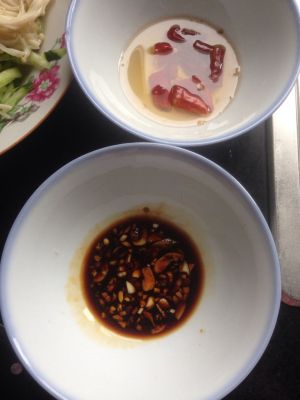 用小碗调汁,把酱油,香油,盐,芝麻,辣椒酱等都当下去,用筷子搅拌一下。ok。