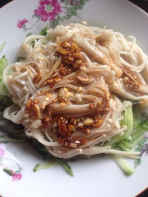 把做好的辣椒酱料,到入金针菇搅拌均匀,洒上葱花既可