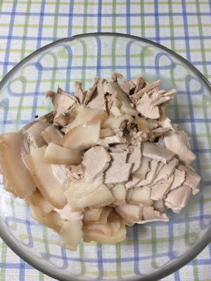 五花肉捞出过凉开水,切片摆盘