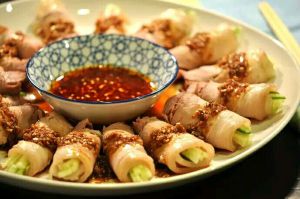 用煮好的肉片包裹黄瓜丝、胡萝卜丝和葱段做成卷摆盘。生抽、辣椒油、蒜泥、白糖和香油调成汁。