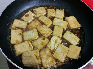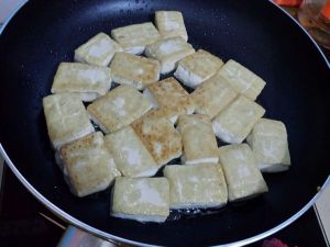 翻过来煎另一面(一块一块的翻,豆腐很嫩滴,小心别翻坏了)至金黄色,盛出