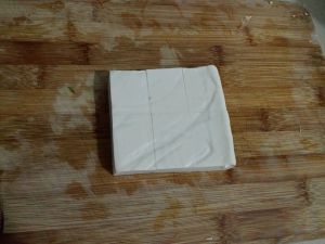 1、豆腐放手中,先切大片再切长条块,然后切成小块放入盘中。