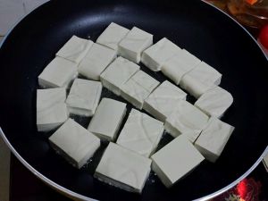 不粘平底锅入少许油,将切好的豆腐一块一块的码入锅中,小火煎至底面金黄