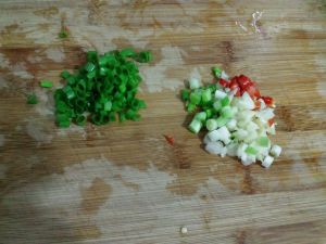大蒜小米辣切末,香葱切葱花,葱白与大蒜辣椒末放一起