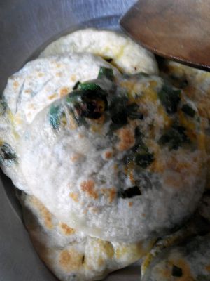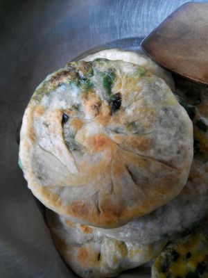 这时面差不多醒好了,开始擀皮像包包子一样只不过得按扁擀一下就上锅烙了。熟了就可以吃了